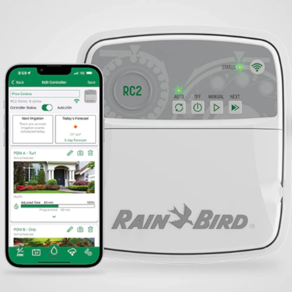 El Rain Bird RC2 es un programador de riego inteligente diseñado para maximizar el ahorro de agua y el control del sistema desde cualquier lugar.